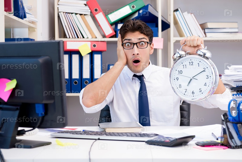 Бизнесмен, работающий в офисе с грудой книг и бумаг