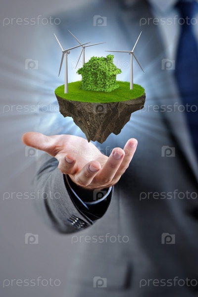 Бизнесмен держит летающий остров в эко концепции