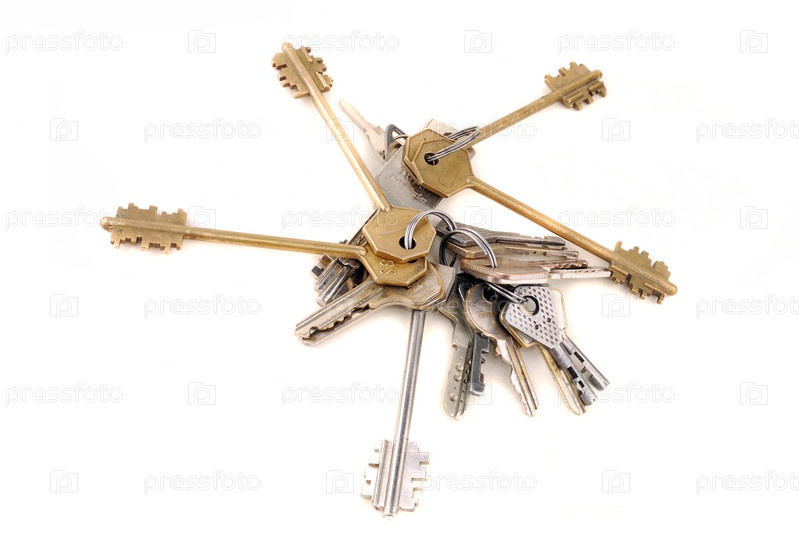 Связка различный ключей на белом фоне