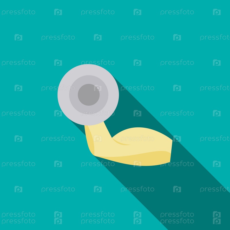 Мускулистый рука с гантелей в плоском стиле на синем фоне