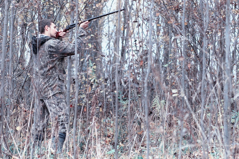 Человек в камуфляже с охотничьим ружьем в лесу