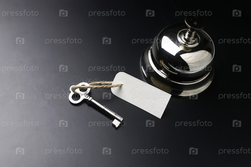 Колокольчик и ключ на стойке регистрации в отеле