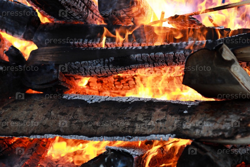Бревна горят ярким пламенем в огне