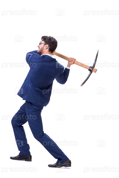 Молодой бизнесмен с топором на белом