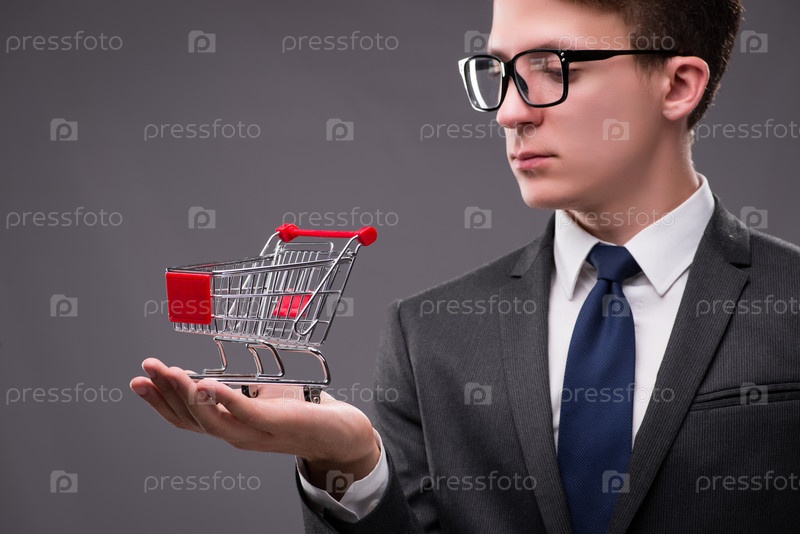 Бизнесмен с корзиной на сером фоне