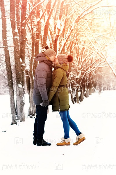 Пара в любви на открытом воздухе зимой
