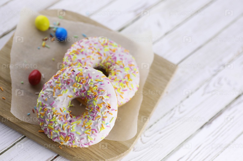 Пончик на деревянном белом фоне