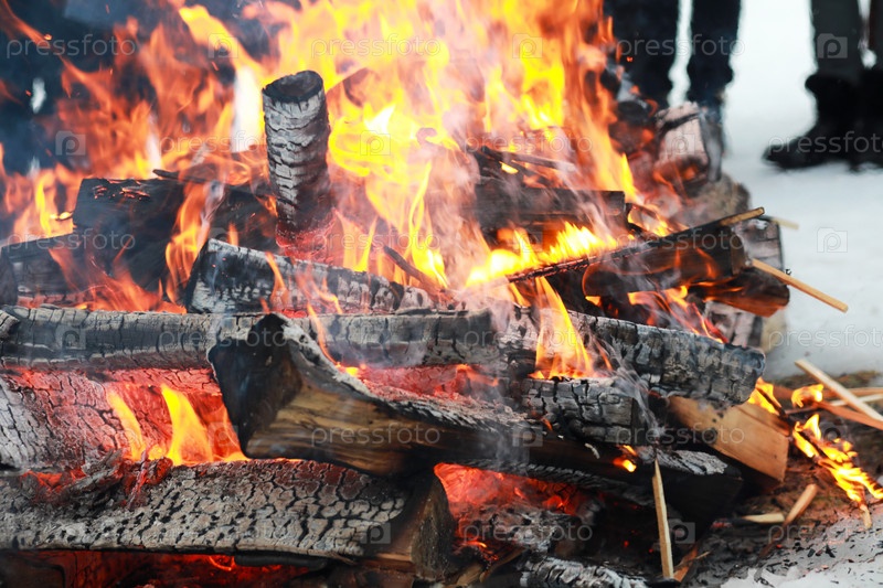 Бревна горят ярким пламенем в огне