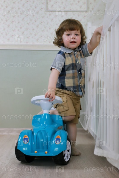 Мальчик сидит на игрушечном автомобиле