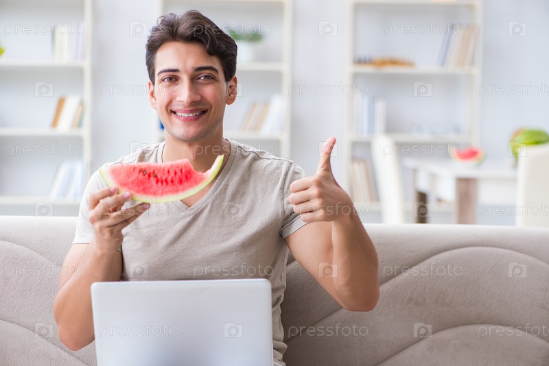 Человек ест арбуз дома