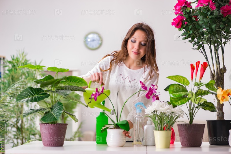 Молодая женщина ухаживает за растениями в домашних условиях