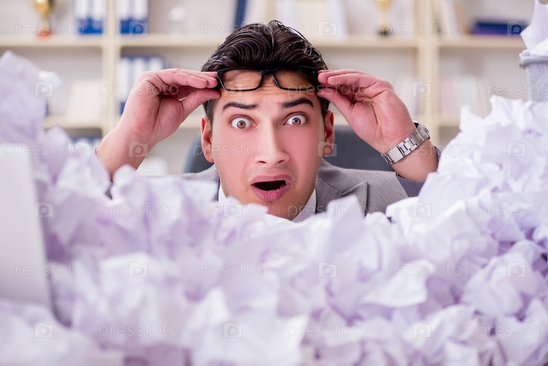 Бизнесмен в концепции переработки бумаги в офисе
