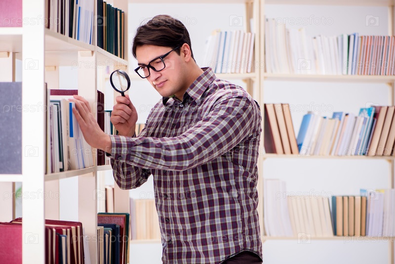 Молодой студент ищет книги в библиотеке колледжа