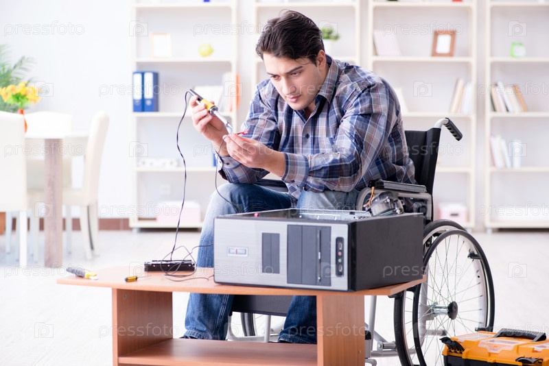 Человек на инвалидной коляске ремонтирует компьютер