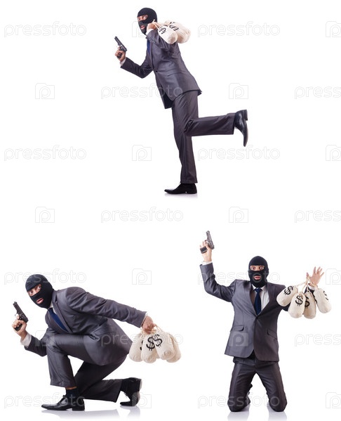 Гангстер с мешками денег на белом