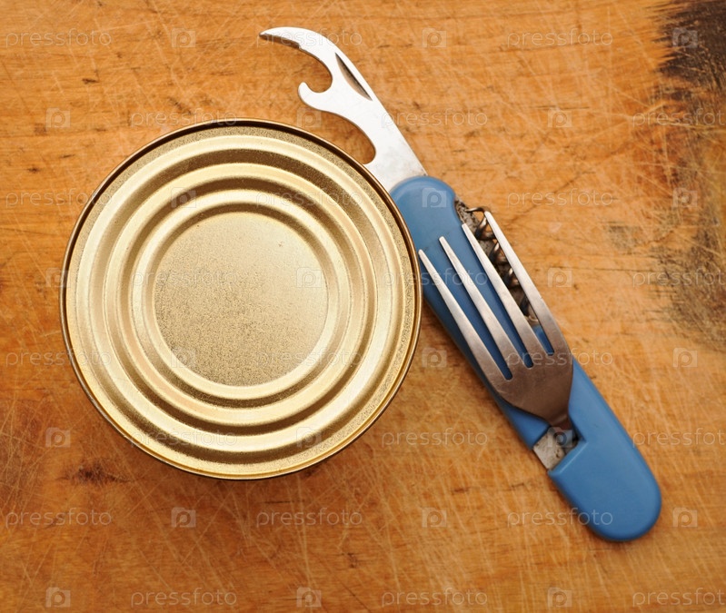 Старый консервный нож и открытая консервная банка на деревянном столе