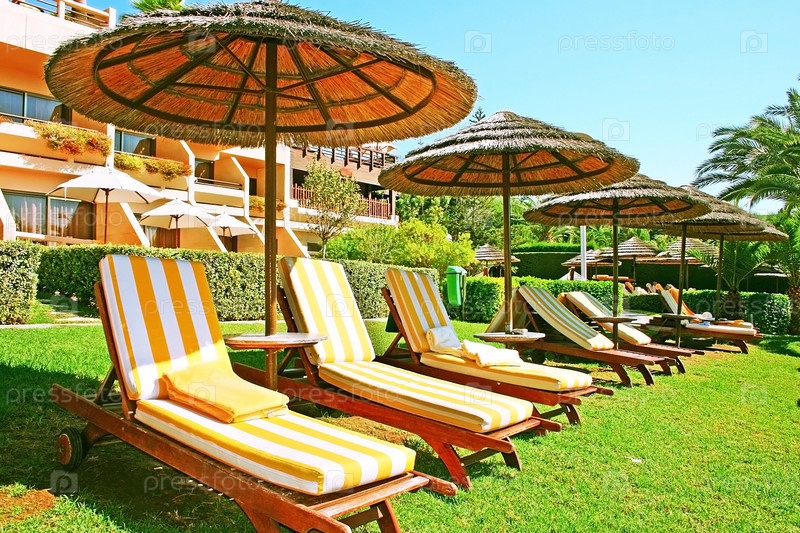 Тропические пляжные зонтики и шезлонги