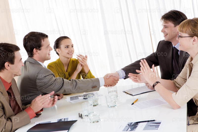 Фото успешных деловых партнеров, рукопожатые после удара большой сделки с аплодирующими сотрудниками рядом