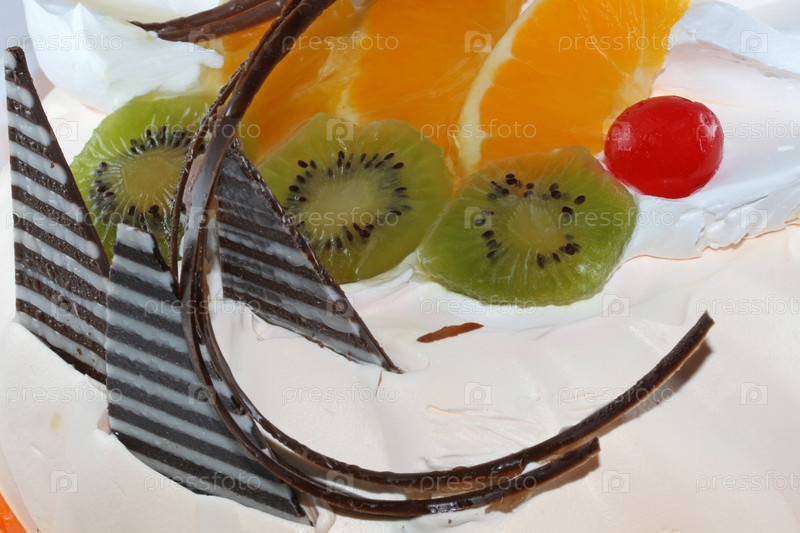 Кусок торта с фруктами и шоколадным кремом