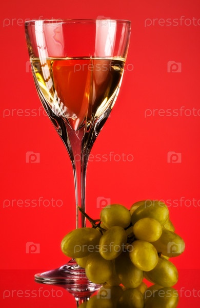 Бокал вина и виноград на красном фоне