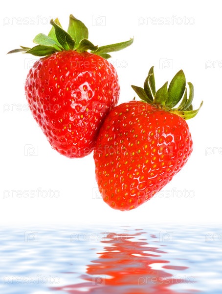 Две спелые клубнички над водой