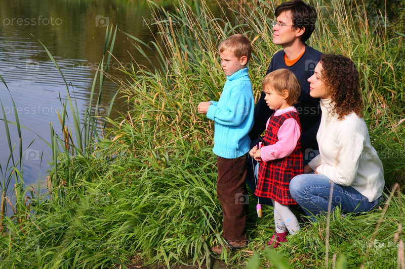 Родители с детьми на берегу пруда