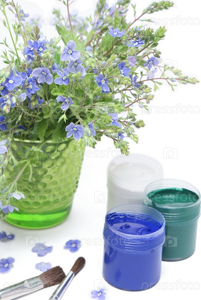 Краски и цветы на белом фоне