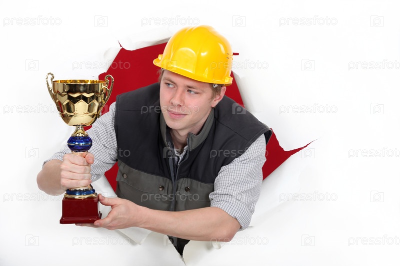 Строитель держит золотой кубок