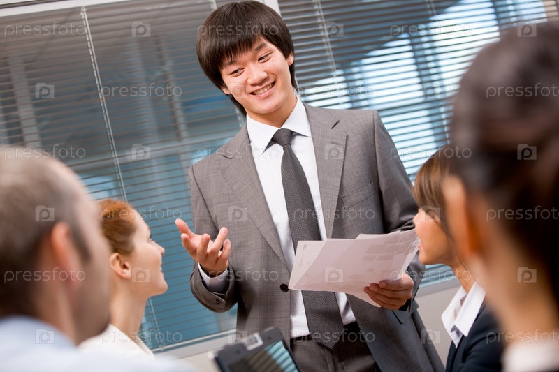Фото уверенного бизнесмена, делающего доклад партнерам на конференции