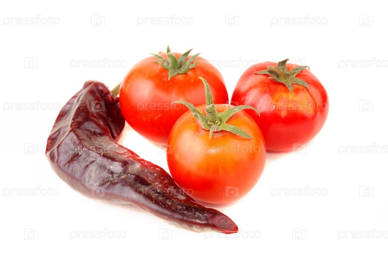 Горький перец красного цвета и помидоры на белом фоне