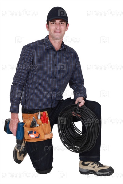 Электрик с дрелью и кабелем стоит на коленях