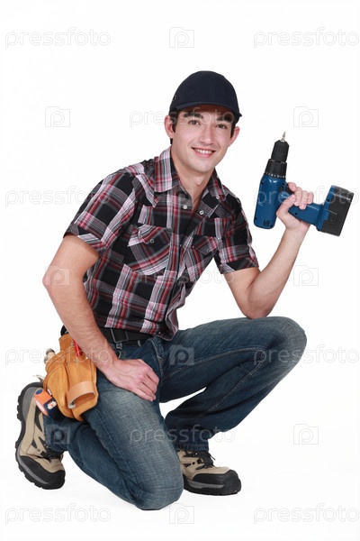 Молодой мастер держит дрель