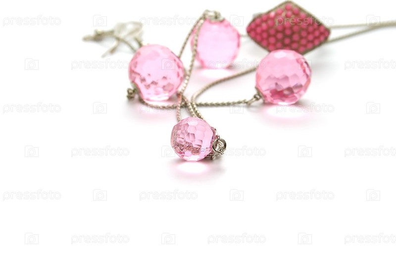 Колье с прозрачными розовыми бусинами и кольцо на белом фоне