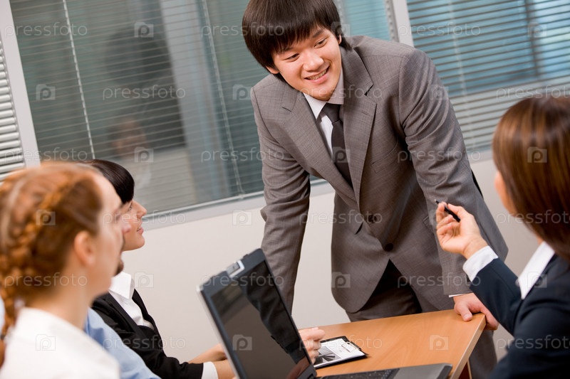Фото нескольких деловых людей, обсуждающих что-то в офисе