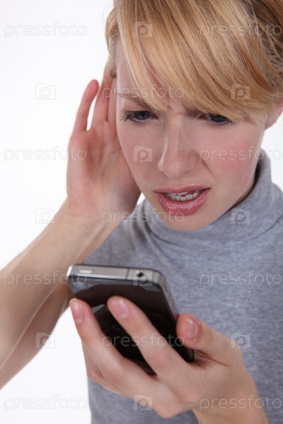 Женщина пытается расслышать собеседника по телефону