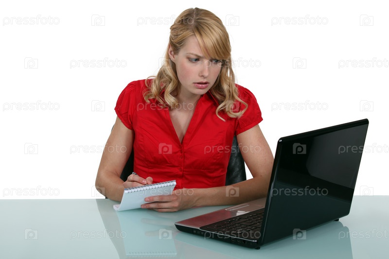 Задумчивая блондинка делает заметки с монитора ноутбука