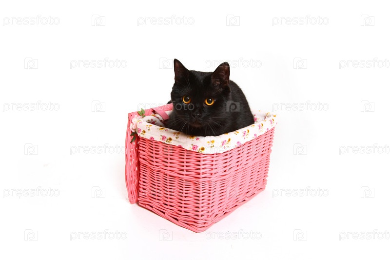 Британский черный кот в розовой корзинке, изолированный на белом фоне
