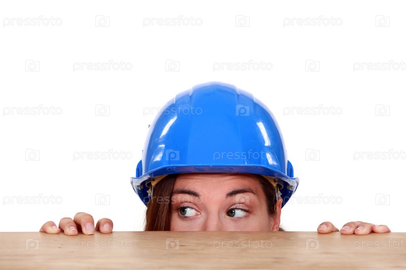 Строитель выглядывает из-под стола