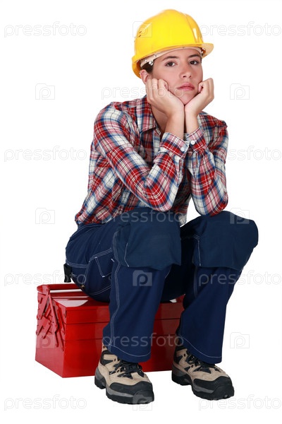 Строитель сидит на ящике для инструментов
