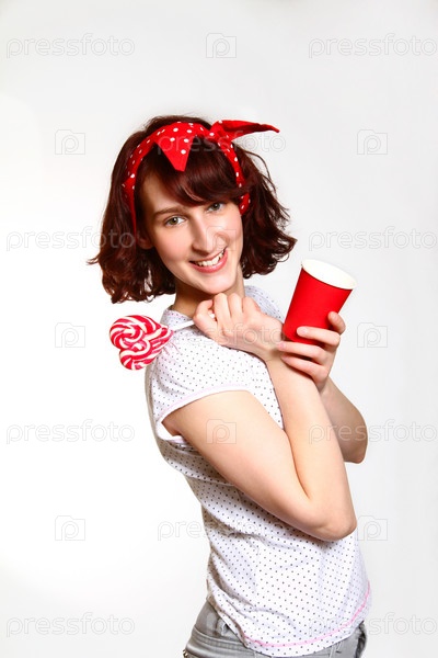 Красивая молодая женщина с леденцом и чашкой, изолированная на сером фоне