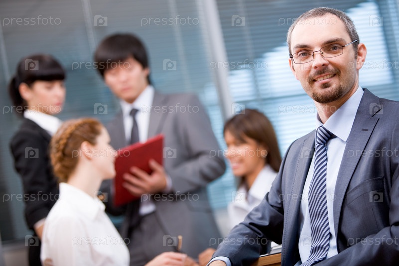 Бизнес-лидер смотрит на камеру с рабочей командой на заднем плане