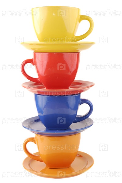 Цветные глиняные чашки на белом фоне