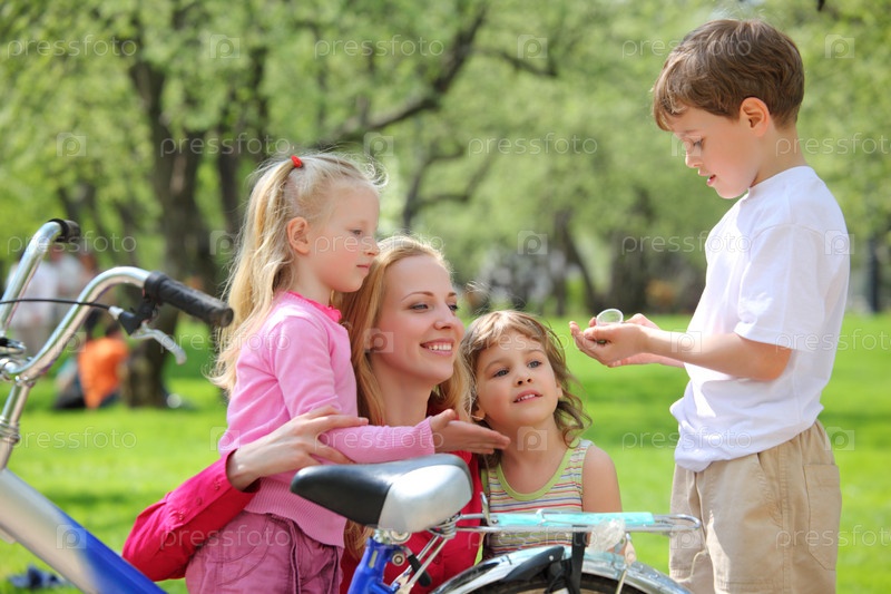 Мать с детьми и велосипед в парке весной