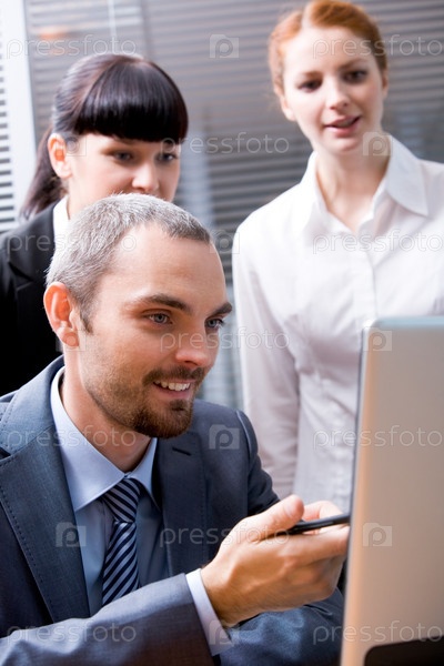Портрет уверенного начальника, указывающего на экран ноутбука во время брифинга