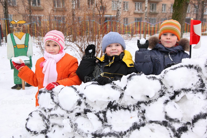 Трое детей в снежной крепости во дворе играют в снежки