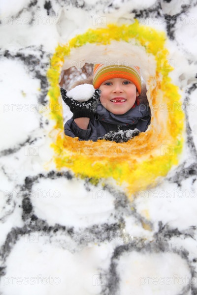 Мальчик со снежком в снежной крепости