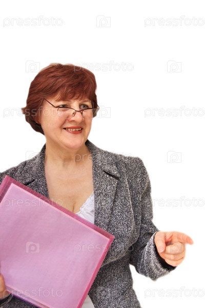 Женщина в очках с папкой в руке на белом фоне