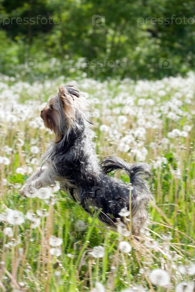 Йоркширский терьер в поле среди одуванчиков