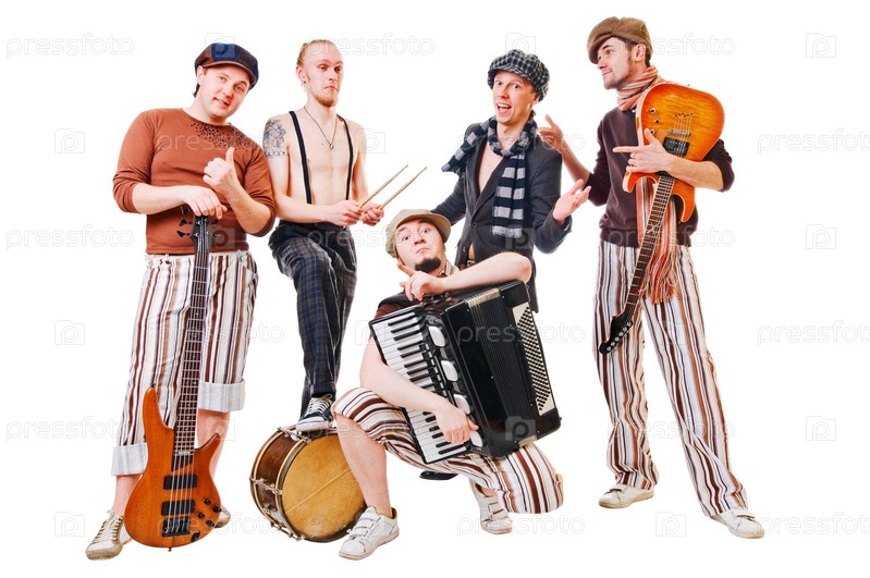 Музыкальная группа с инструментами на белом фоне
