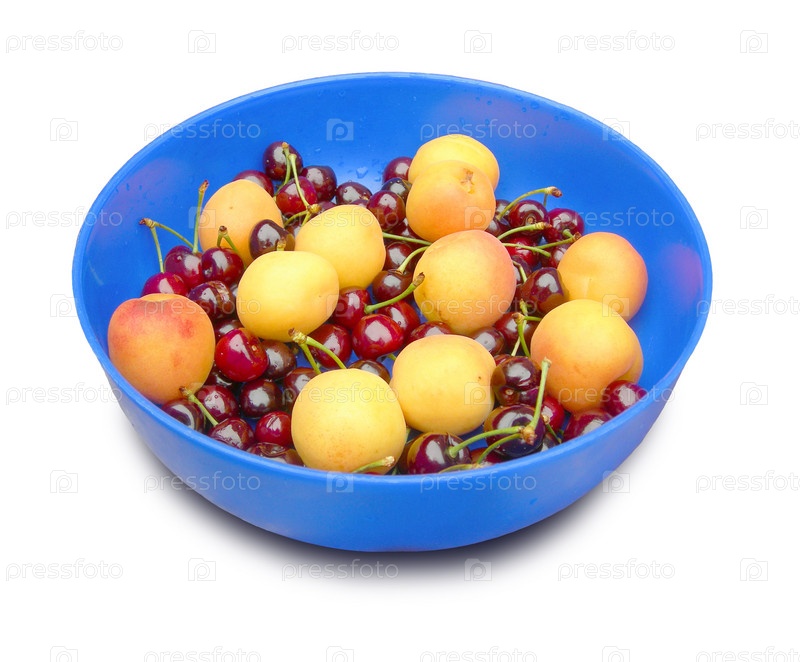 Спелые абрикосы и вишня в синей тарелке